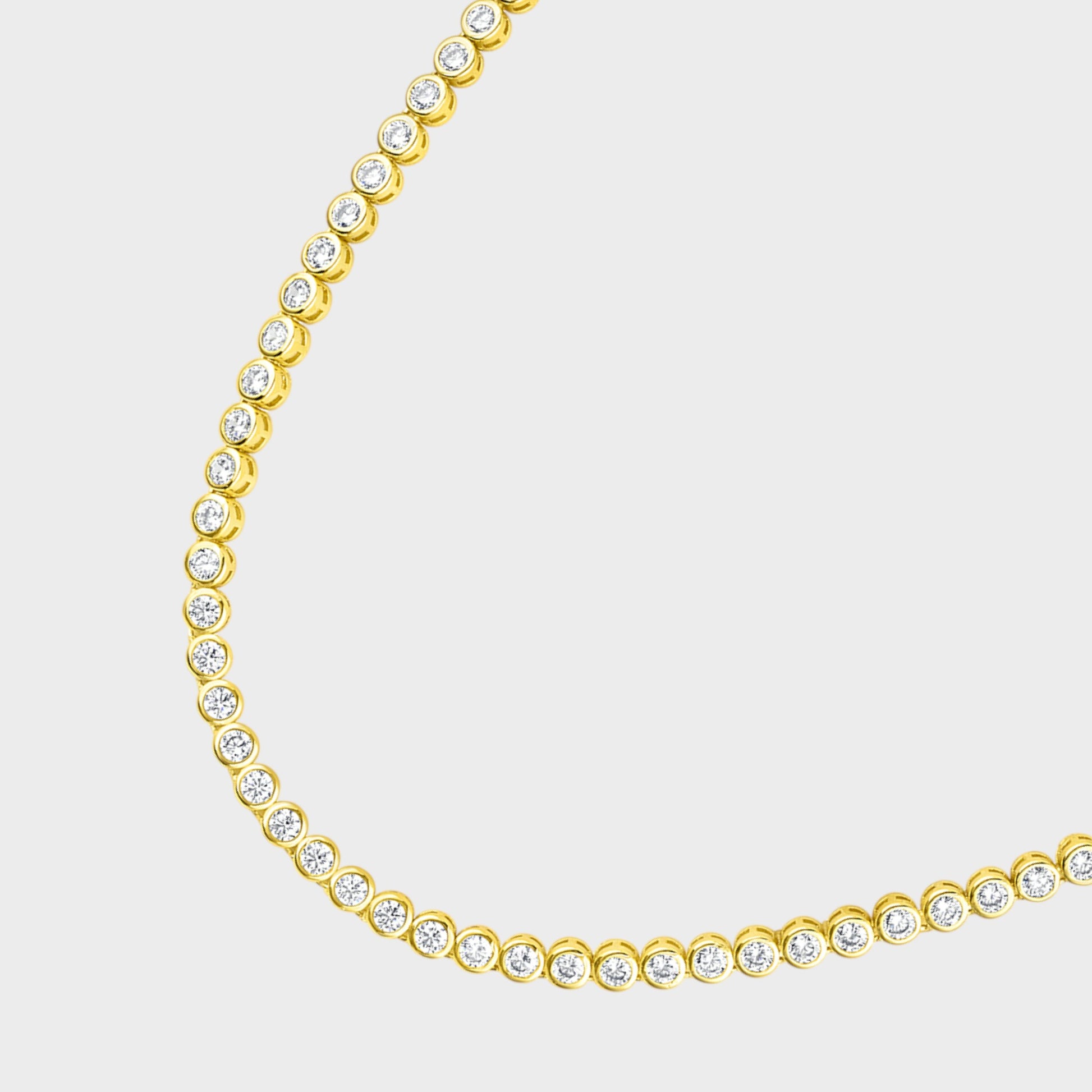 The CHOE Round Bezel Tennis Necklace features a continuous row of round Cubic Zirconia, each set in a smooth bezel for a modern, elegant look. Designed for lasting shine and everyday wear. This timeless piece makes a sophisticated gift or a perfect addition to your jewelry collection. Wear it as a statement piece or stack it with your favorite necklace. Available in rhodium plated sterling silver and 14k gold vermeil. Hypoallergenic, tarnish-resistant and nickel & lead free.