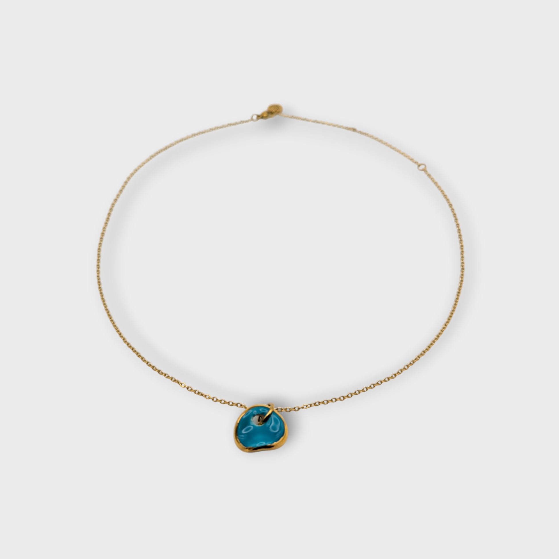 This delicate pendant merges Spanish artisanal tradition with modern minimalism. The hand-sculpted ceramic piece sits gracefully on an 18K gold-plated stainless steel chain, offering a refined touch that works beautifully on its own or layered with other necklaces. Perfect for those who appreciate quality craftsmanship and understated elegance in their everyday jewelry collection. Hypoallergic and tarnish resistant.